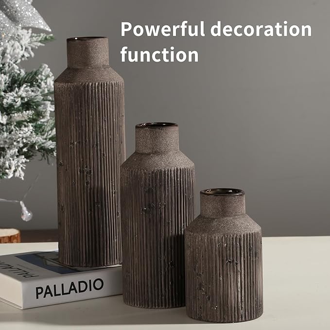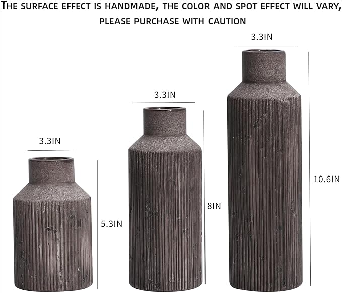 - ๐ธ [This farmhouse vase is made of high-quality ceramics, sturdy and durable] This antique vase is made of high-quality ceramics, sturdy and durable. This ceramic vase set of 3 has a height of 5.3IN, 8IN, 10.6IN, and a diameter of 3.3IN. This clay vase is suitable for most home decorations.