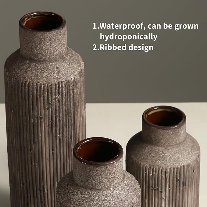 - ๐ธ [These vases have a rustic retro style] This rustic vase set of 3 is designed to be waterproof and you can also grow flowers. This vintage vase is a beautiful decoration in itself. The retro rustic style is suitable for any of your home decorations.