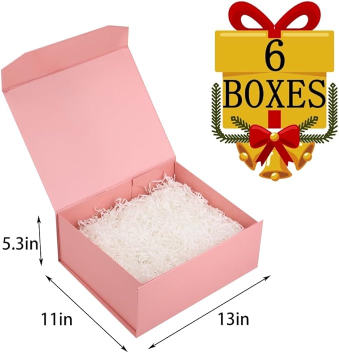 6 Pink Gift Boxes, 13x11x5.3 Inch, Magnetic Lids, Crinkle Paper, Perfect for Birthdays and Gift-Giving Occasions