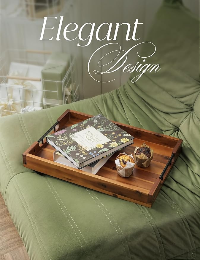 - Premium Acacia Wood: Crafted from high-quality Acacia wood, this decorative wooden tray is durable and features a rich, natural finish. Its unique wood patterns and warm hues bring a touch of rustic charm to any space. With a dimension of 20"L x 14"W x 2.3"H, this tray makes an attractive centerpiece for your kitchen or living room