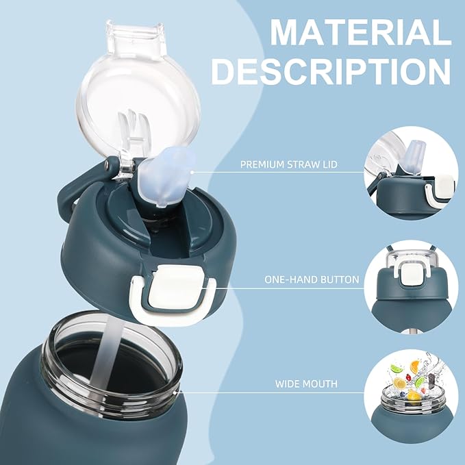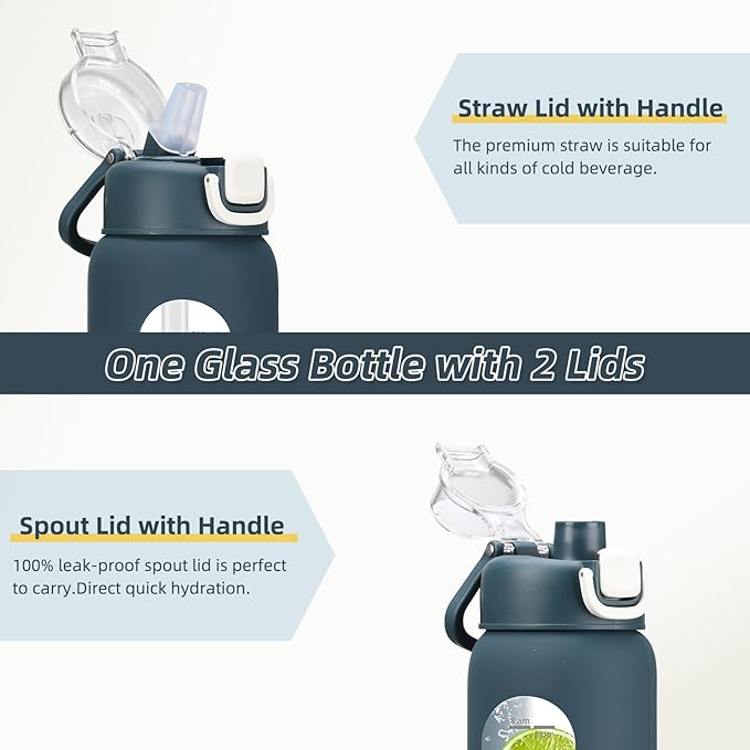 - [TWO DIFFERENT LIDS DESIGN]The 24 oz glass water bottle equipped with a spout handle lid and a straw handle lid,leakproof and durability, 2 lids both can be easily opened with one hand When you are on-the-go.The Motivational 1 Liter water bottle meet your different drinking needs on different occasions.
