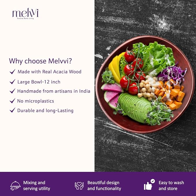 - PREMIUM ACACIA WOOD: Crafted from high-quality, durable acacia wood, this wooden salad serving bowl is 2X resistant to cracks, stains, and wear & tear vs bamboo and other wooden bowls. Sustainably sourced, it adds a natural touch to your kitchen while ensuring safe, long-lasting use.