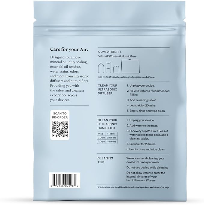 - QUICK CLEANING FOR YOUR DIFFUSER OR HUMIDIFIER: Vitruvi Cleaning Tablets tackle hard water stains, essential oil residue, and mineral buildup in minutes—no scrubbing required, preserving device performance and longevity.