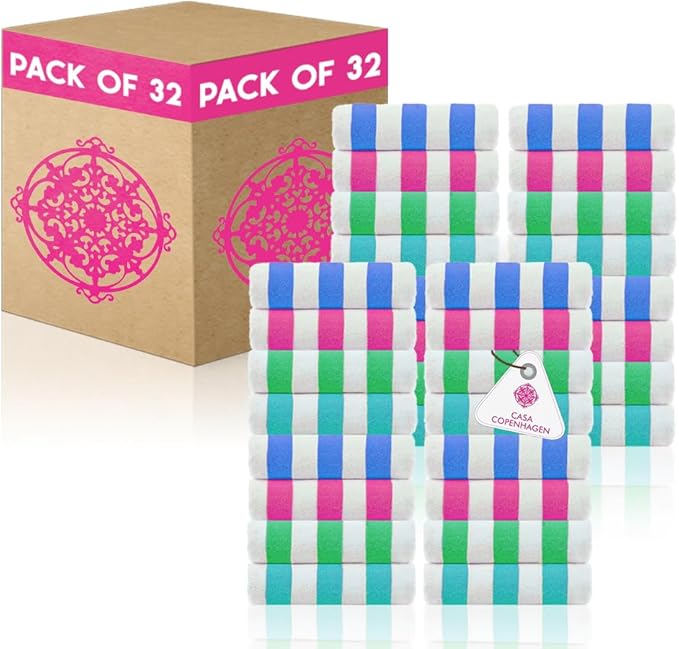 CASA COPENHAGEN Cabana Beach Towels Designed in Denmark Rough and Tough, Quick Dry, for Pool, Bath & Shower 30x60 inches 32 Pieces Cotton Beach Bath Towels Set - Turquoise,Royal Blue,Pink,Green