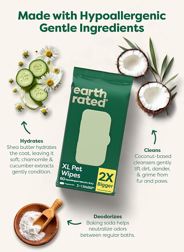 Earth Rated XL Pet Wipes for Dogs & Cats, 3-in-1 Unscented Hypoallergenic Cleaning, Deodorizing and Hydrating Extra Large Grooming for Body, Paws and Butt, Unscented, 60 Count