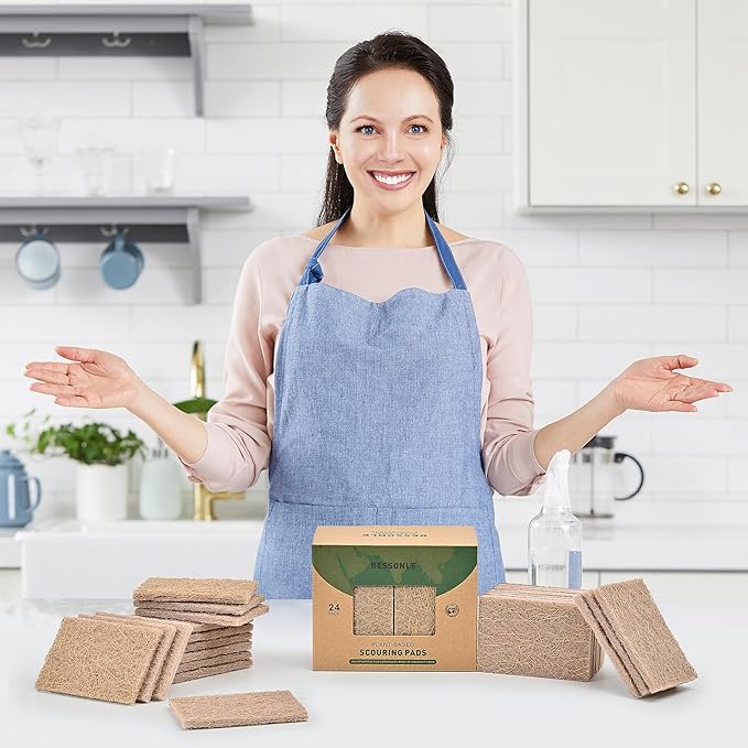 - NATURAL SCOURING PADS - BESSONLE's biodegradable heavy duty scour pad is made with coconut fibers binded together with recycled fibers for a mix of great cleaning performance and care for the environment(The box is also). This green scouring pad makes it easier than ever to go green in the kitchen!