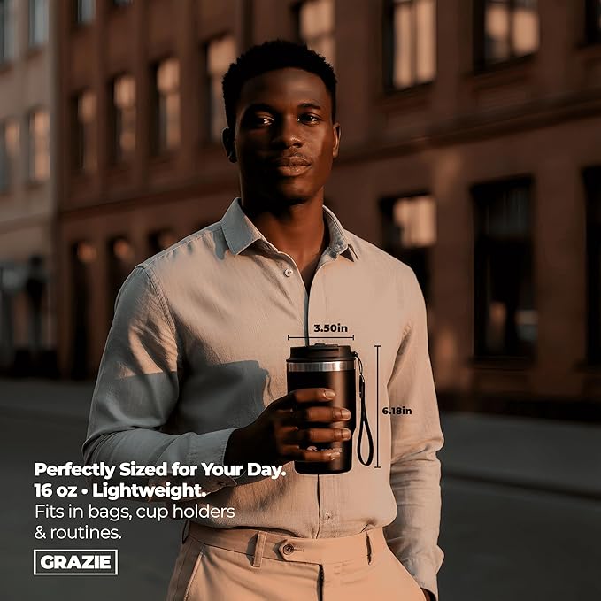 - COMPACT YET CAPACIOUS FOR LIFE ON THE GO Don’t be fooled by the sleek size — this 16 oz tumbler packs in enough coffee or water to power your morning commute or afternoon adventure. Whether you’re sipping matcha before yoga, fueling a late shift, or keeping water cool during class, it delivers performance without the bulk. Add it to your daily backpack, lunch bag, or camping gear. Compact, leakproof, and always ready.