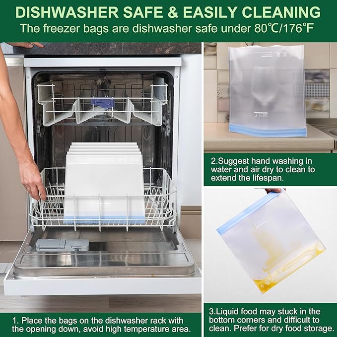 - Freezer & Dishwasher Safe: With heat resistance from -50℃/-122℉ to 80℃/176℉ , the freezer bags silicone can lock out freezer burn while keeping food fresh and full of taste, perfect for freezing meat, chicken, fish, fruits and vegetable. Upgraded PEVA material that is dishwasher safe. however, please skip high-temperature functions such as the dishwasher's drying to extend the lifespan of the gallon bag. We suggest alternating hand wash and air dry to clean for long-term usage. Not microwave friendly.