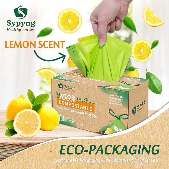 - COMPOSTABLE TRASH BAGS – Made from eco-friendly materials, our 6–8 gallon bags are 100% biodegradable and compostable. Lightly lemon-scented for a fresh, clean smell, they’re perfect for kitchen scraps, garden waste, and office trash. Certified to meet ASTM D6400 and OK Compost HOME standards, these bags break down naturally in your home compost bin—providing a convenient and responsible alternative to plastic bags.