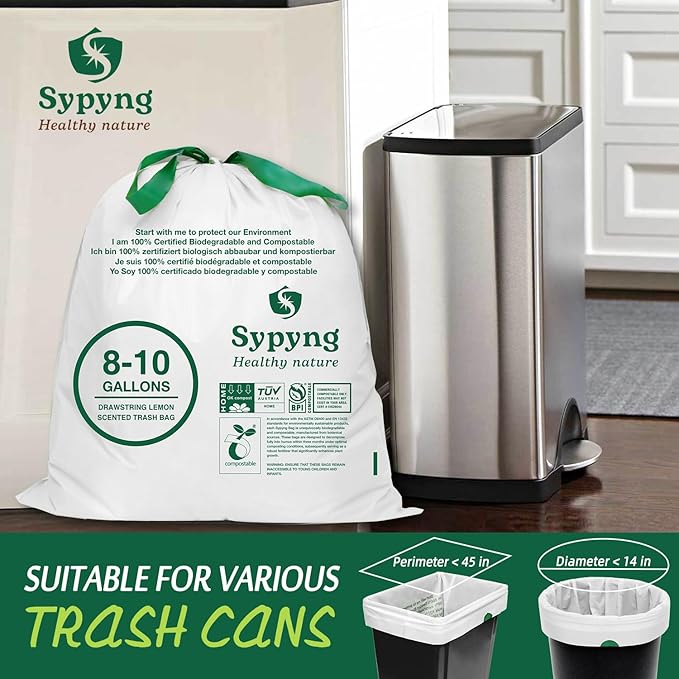 - COMPOSTABLE TRASH BAGS – Leakproof and Odor Control - Made from eco-friendly materials, our 8–10 gallon bags are 100% biodegradable and compostable for Medium to Large Bins. Lightly lemon-scented for a fresh, clean smell, they’re perfect for kitchen scraps, garden waste, and office trash. Certified to meet ASTM D6400 and OK Compost HOME standards, these bags break down naturally in your home compost bin—providing a convenient and responsible alternative to plastic bags.