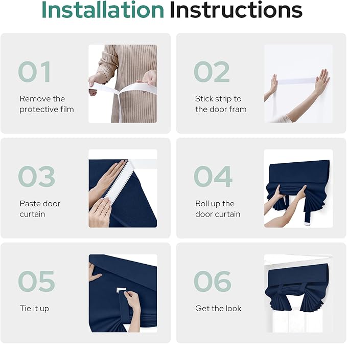 - 🌸EASY HANGING: The package includes 1 door curtain panel and 1 adhesive strip. It can be easily installed without any tools or curtain rods. Just follow our instructions picture to install, put the sticky strip on the glass, and join together with the sticking place on the door curtain panels firmly.