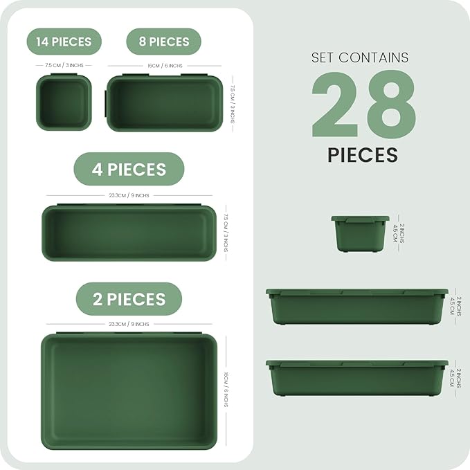 - 【28Pcs & 4 Sizes】 ---- One set includes Army Green 28pcs storage bins in 4 different sizes, which help you customize combinations to store items and organize drawer in shelves/closets/cabinets/dressers. Includes: 9 inch*6 inch*2 inch, 8 Long sizes:6 inch*3 inch*2 inch, 4 Medium sizes:9 inch*3 inch*2 inch, 14 Small sizes:3 inch*3 inch*2 inch.