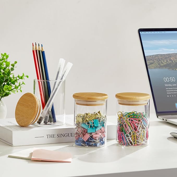 - Bathroom Decor & Vanity Decor: The q tip holder for bathroom is made out of nice glass, not plastic, combined with the natural bamboo lids, add a touch of warmth and elegant to your space; a wonderful addition to bathroom decor and vanity decor.