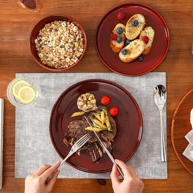 - PERFECT SIZE FOR MULTI-PURPOSE: This 12-piece Cherry Red dinnerware set includes 10-inch dinner plates, 8-inch salad plates, 26oz cereal bowls, service for 4 people. Not only suitable for your own family use, but also as a great gift ideal for housewarming, wedding, birthday, family reunion, or any other party.