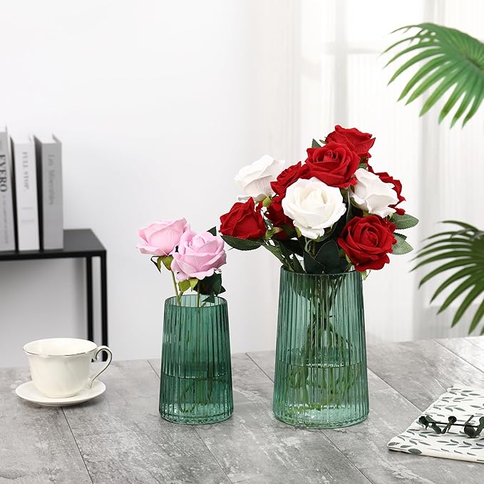 Ribbed Flower Vases Set of 2, Green Vases for Flowers, Flower Vase for Bouquet, Modern Ribbed Glass Vase for Living Room, Bedroom, Dining Table, Office, Wedding, Centerpieces