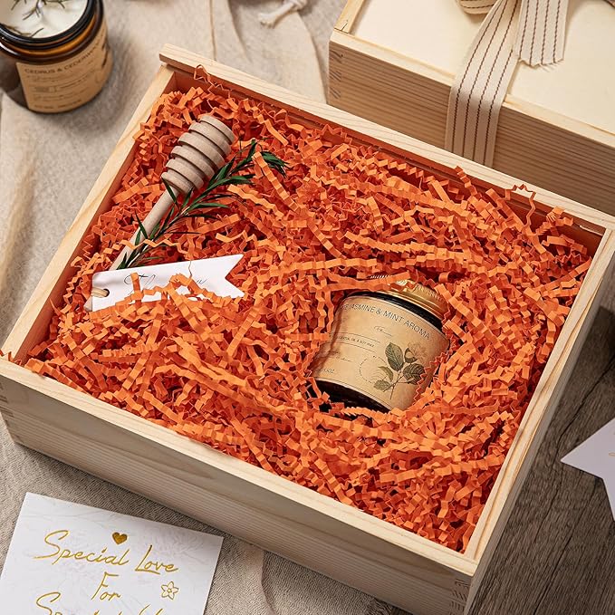 - Shredded Paper for Gift Box: Decorate your gift with this orange crinkle paper to fully display your gift and make your gift more attractive.Perfect to fill the extra spaces in your gift boxes or basket.