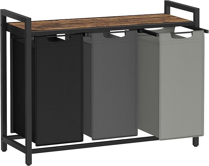 VASAGLE Laundry Hamper, Laundry Basket, Laundry Sorter with 3 Pull-Out and Removable Bags, Shelf, Metal Frame, 3 x 10.6 Gallons (40 L), 36.4 x 13 x 28.4 Inches, Tricolor and Rustic Brown UBLH301X01