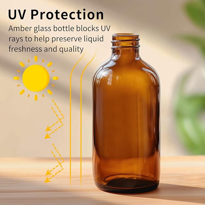 - Multipurpose Storage with UV-Protective:These 8oz amber Boston round bottles are perfect for storing homemade vanilla extract, essential oils, herbal medicine and syrups. The durable amber glass protects your contents from UV light, keeping them fresh and effective.