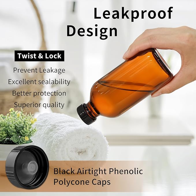 - Leak-Proof & Airtight Seal:Each brown empty glass bottle features a black phenolic cap with a polycone liner that creates a tight, leak-proof seal—perfect for storing essential oils, liquids, or fermented goods without spills or contamination.