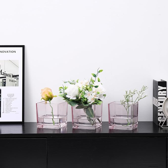 Square Glass Vases Set of 9, 4"x 4"x 4" Flower Vases for Centerpieces, Pink Glass Vase for Flowers, Small Vase for Wedding, Party, Home Office Decoration