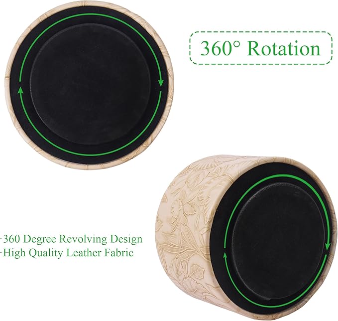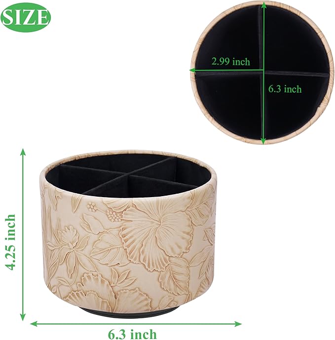 Hennaja Round Leather Art Supply Organizer,Remote Control Holder,360 Degree Spinning,Multi-Functional Pencil Holder,4 Compartments Desktop Stationary Organizer(1-Carved Light Brown)