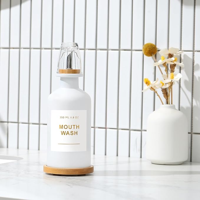 - Apply to Any Bathroom Decor: A bamboo tray and anti-slip pad provide a stable base for the mouthwash bottle, keeping your countertop dry and organized. The warm tones of bamboo complement the sticker's golden font, creating a harmonious natural beauty.