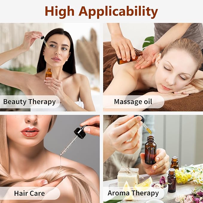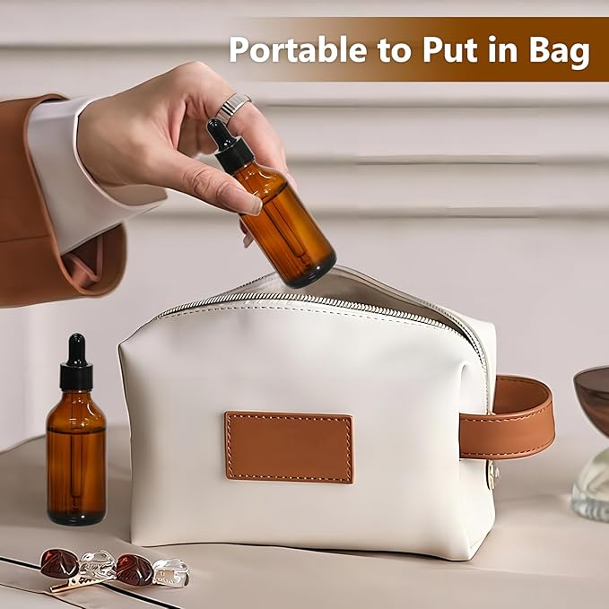 - Lightweight & Portable: These 2oz amber glass dropper bottles are designed for easy portability, slipping effortlessly into your purse, gym bag, or travel kit. Take your favorite oils, perfumes, or skincare blends anywhere, like sunbath, massage, hair salon, or aromatherapy, without spills or leaks. A must-have travel essential for on-the-go users.