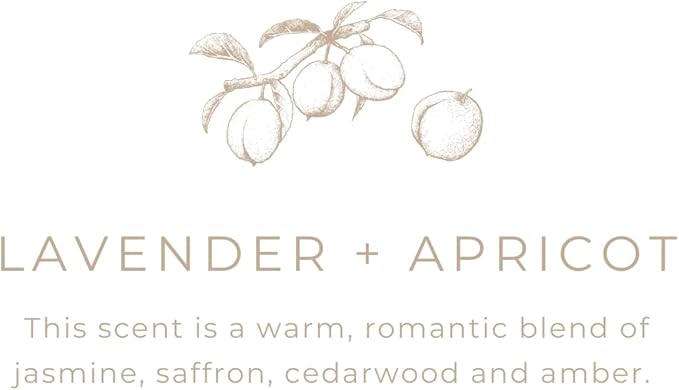 - THE SCENT: Our Lavender + Apricot is an elegant blend of jasmine and dark fruits smoothed out by an amber and tonka base. This luxurious scent starts with hints of citrus and peach that open up to a heart of red and black currants. Jasmine blossoms envelop the fruit notes with a dreamy, romantic floral aroma. The rich aromas of tonka, vanilla and amber are bolstered by hints of anise and black tea to round out this graceful & cozy fragrance.