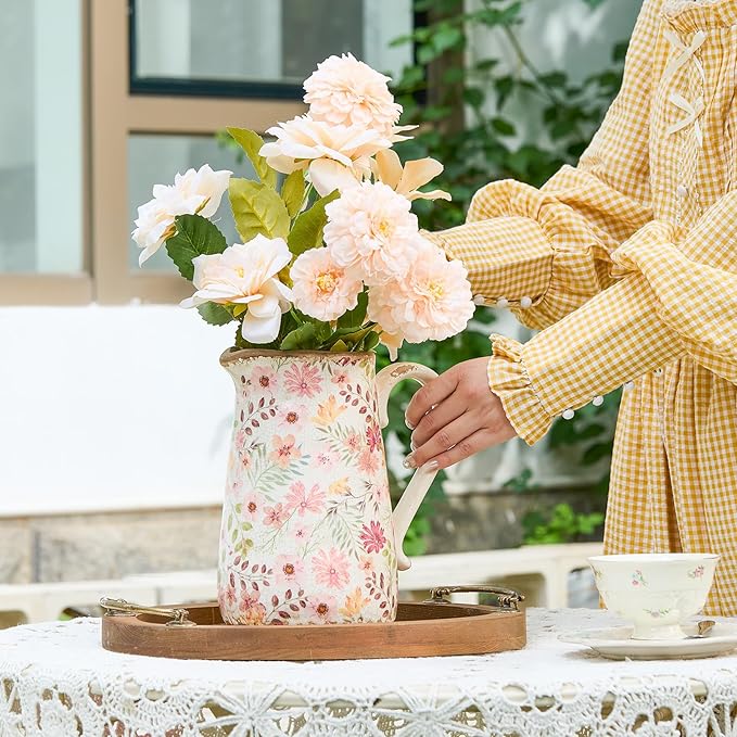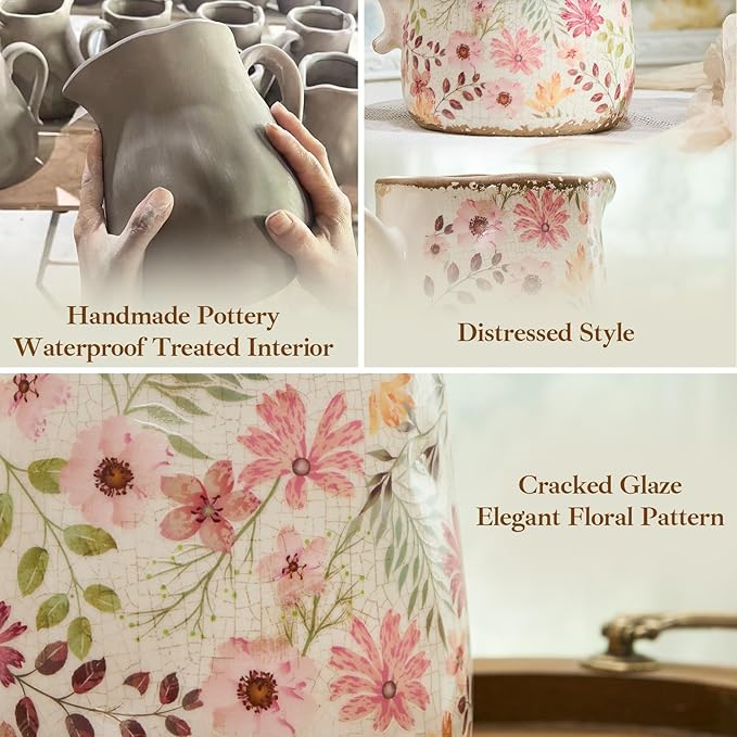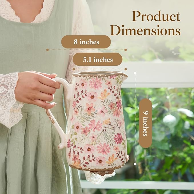 Retro Rustic Large Ceramic Vase with Handle, Distressed Farmhouse Pitcher for Home, Ideal Shelf Decor, Colorful Daisy Floral Vase for Living Room Bedroom Office Table Centerpiece Decorations 9 Inch