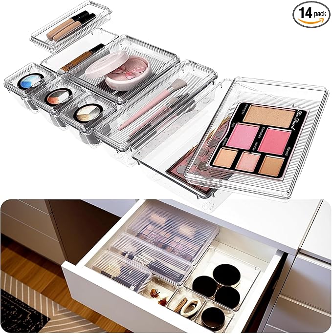 14 Pcs Drawer Organizer for Makeup/Office Supplies/Vanity/Desk Drawer Organizers, Acrylic Organizers, Shallow Drawer Organizers with Lid Design