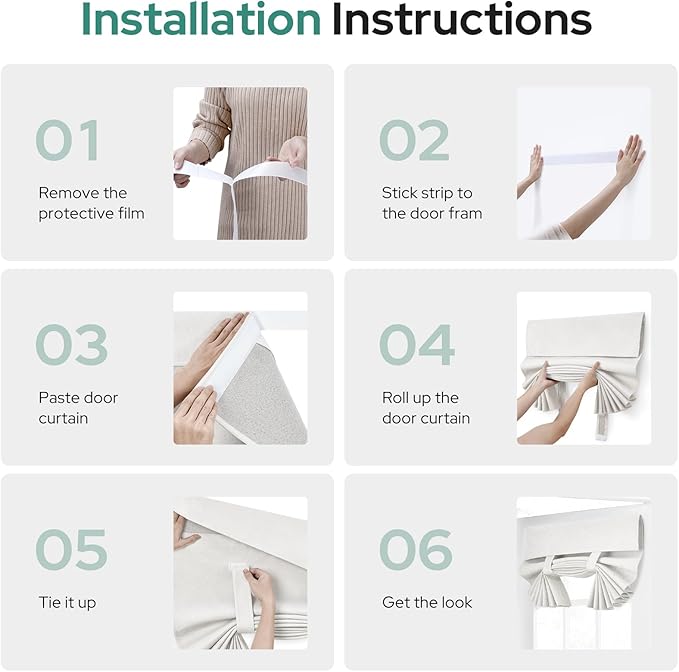 - 🌸EASY HANGING: The package includes 1 door curtain panel and 1 adhesive strip. It can be easily installed without any tools or curtain rods. Just follow our instructions picture to install, put the sticky strip on the glass, and join together with the sticking place on the door curtain panels firmly.