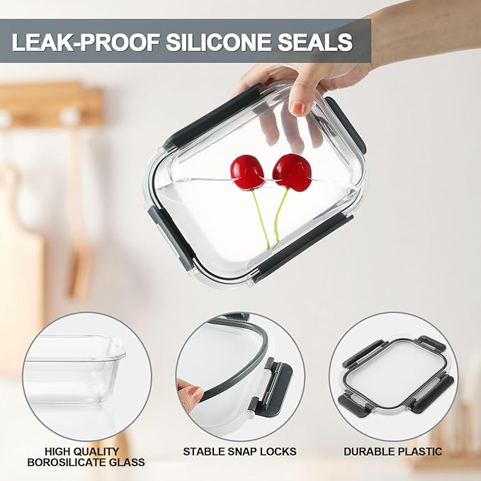 - Airtight Smart Lid -- Glass food storage containers use snap-on lids with silicone gaskets, 100% airtight, not easy to leak, better sealing, locking freshness for longer, ingredients stay fresh for longer.