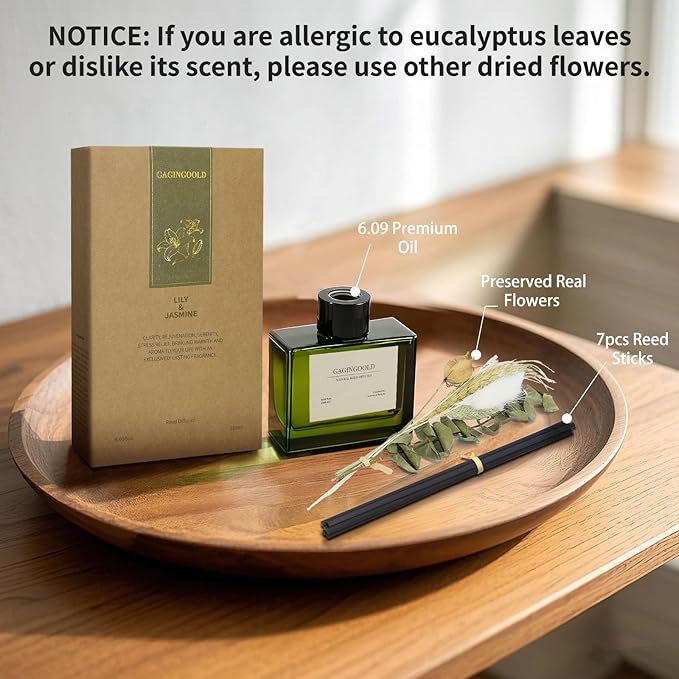 - Premium Complete Set: Enjoy everything you need: 6.09 oz (180 ml) of non-toxic sandalwood fragrance liquid, 7 premium reed sticks, a stylish recyclable glass vessel, real dried flowers, and a gift box – all designed for effortless customization of your home's ambiance.