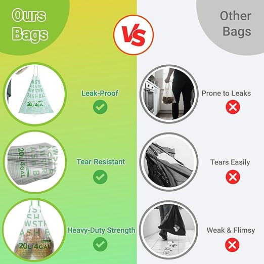 - Reinforced Drawstring Closure – Locks in Odors:Upgraded drawstrings make tying and lifting effortless while preventing leaks or spills. Effectively seals in odors from food, tissues, or pet waste—keeping your space fresh and hygienic.