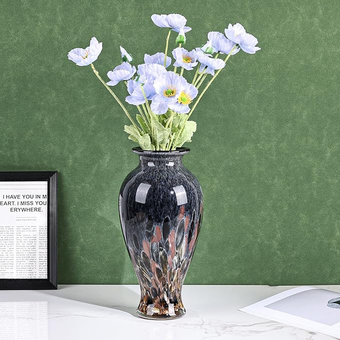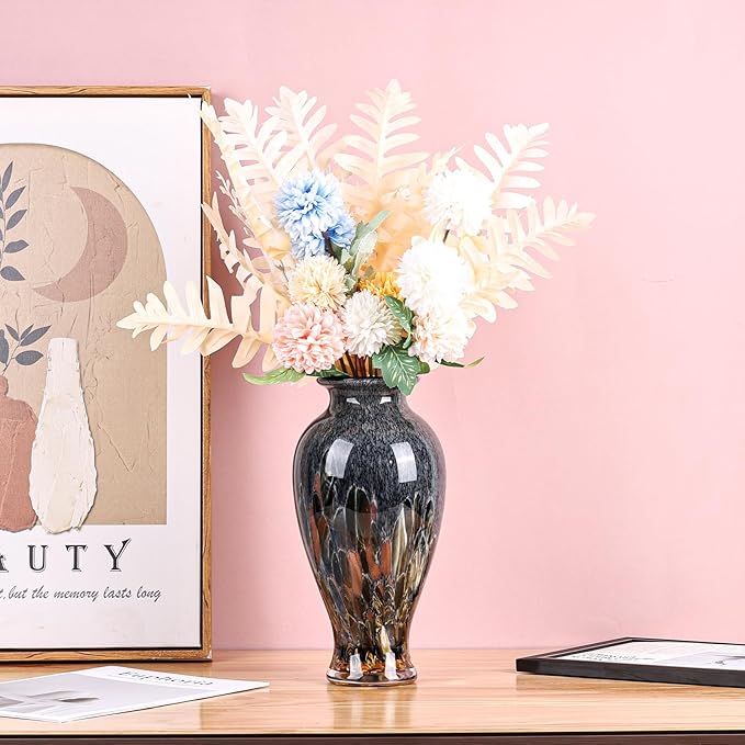 Hand Blown Glass Vase 11.8" Tall Beautiful Amber Blue Sea Wide Mouth Bud Vase for Table Centerpiece, Painted Colorful Murano Glass Flower Vases for - Home Entrance Wedding Center