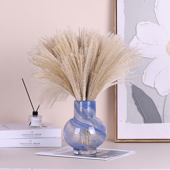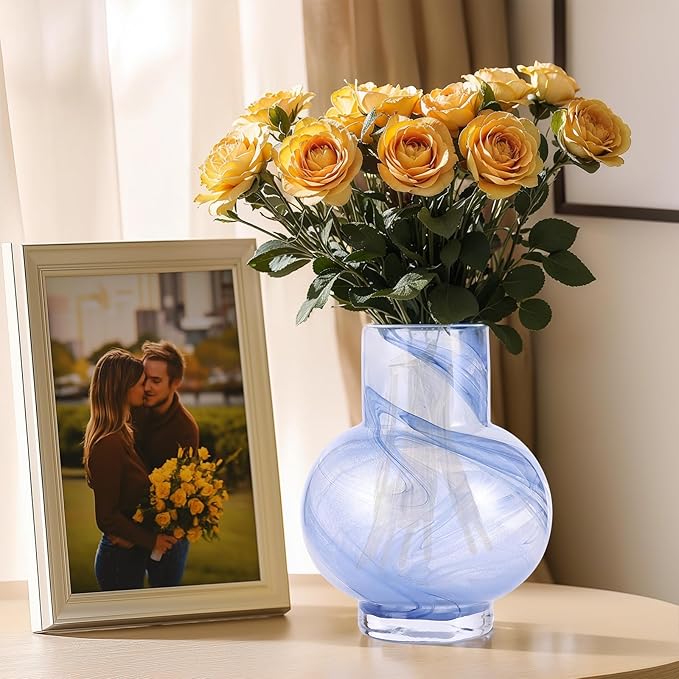 - [HAND BLOWN | UNIQUE GLASS CRAFTING] Each blown glass vase is handcrafted by artisans, the glass is delicate and smooth, the curved surface refracts the light and creates rich visual layers. The fluid mix of blue and amber tones makes it a decorative art piece with both vintage and modern styles, suitable for any home style.