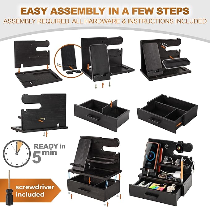 - SMART DESIGN: The stand is easy to assemble (assembly manual attached) and сompatible with all kinds of smartphones; The stand with drawer also has compartments for wallets, documents, glasses, watches, fitness trackers, bracelets, keys, stationary etc