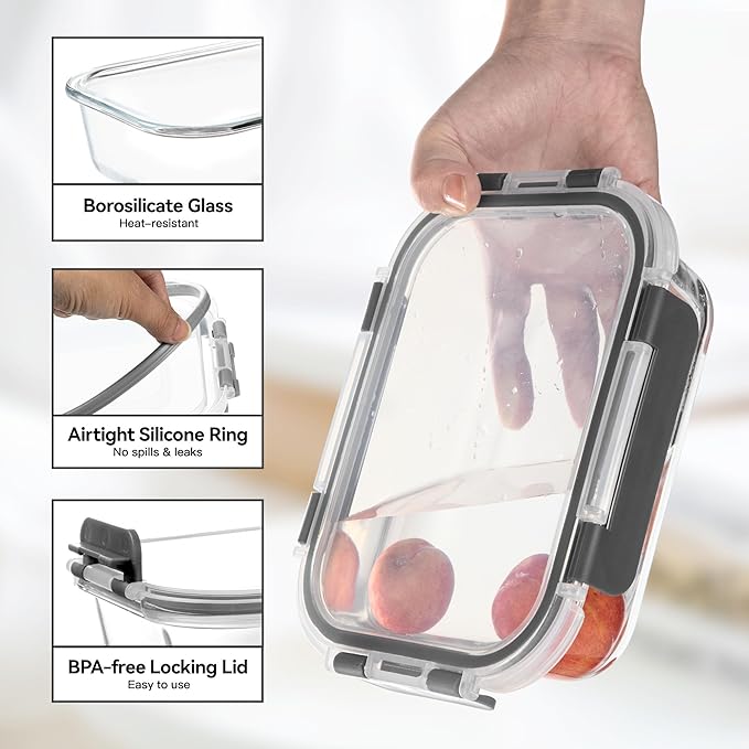 - AIRTIGHT SEALED LIDS: These glass storage containers with plastic lids and silicone ring creat an airtight seal to keep your food fresh longer while preventing leaks and spills. Perfect for work lunches, gym meals , or picnics. The snap-on lids are BPA-free and easy to use.