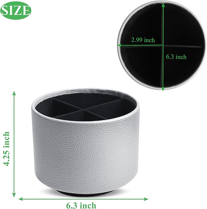 Hennaja Round Leather Art Supply Organizer,Remote Control Holder,360 Degree Spinning,Multi-Functional Pencil Holder,4 Compartments Desktop Stationary Organizer(1-Lichee Silver)