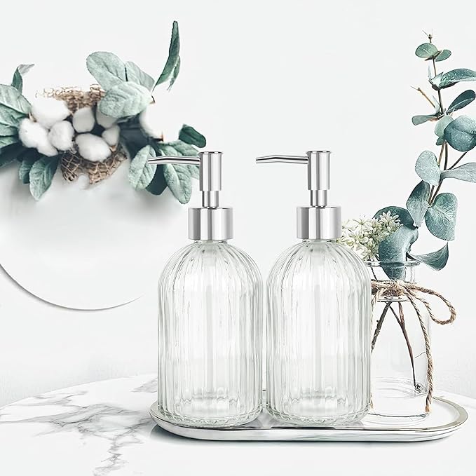 - 【Stylish Design】: Soap dispenser is designed with vertical stripes which is delicate and gorgeous. Those delicate lines match the crystal clear and decorate your kitchen or bathroom is both stylish and beautiful. Enhance your bathroom decor with this Clear Refillable Glass Soap Dispenser Set