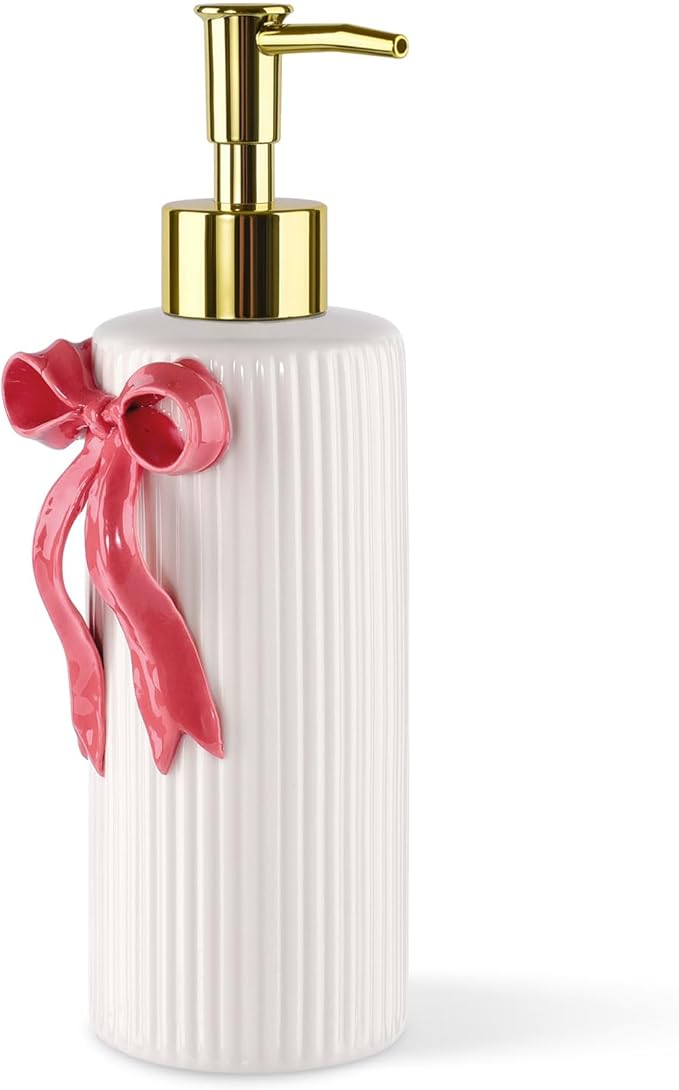 Handmade Ceramic Bow Soap Pump Dispenser Hand Lotion Liquid Dispenser Refillable for Kitchen and Bathroom Decorative (Ribbon Red)