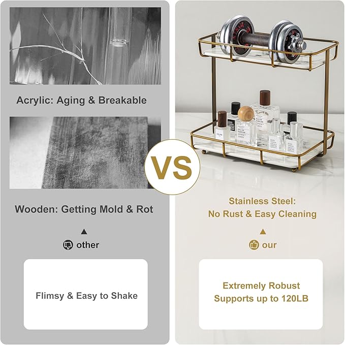 - EASY TO CLEAN: With a sturdy stainless steel frame that can prevent corrosion in wet places and removable ceramic trays with a luxurious marble pattern, this dresser top stand is both functional and easy to clean.