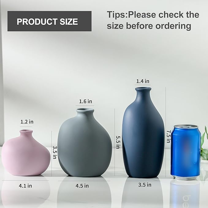 - Home Décor Ceramic Vase – (Dimensions: 7.5” x 3.5”; 5.5”L x 4.5”W; 3.5”L x 4.1”) This vase set is the ideal home house decor, effortlessly complementing any room or style. Whether your aesthetic is boho, modern farmhouse, rustic, or cottagecore, this versatile set brings a timeless, elegant touch to your space.