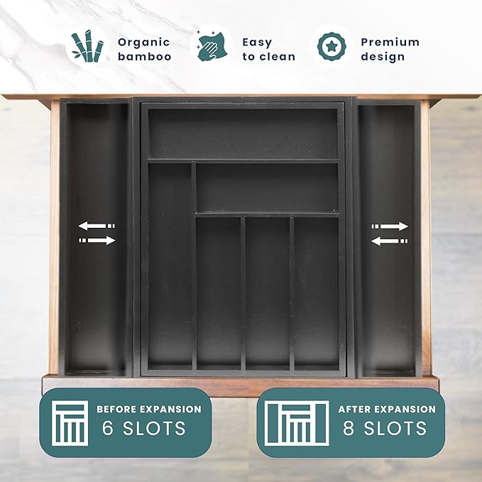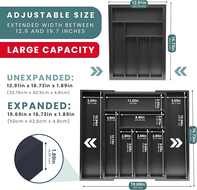 - Customizable Fit for Any Drawer Size: Easily expand this adjustable cutlery tray to perfectly fit a wide variety of drawer sizes in your kitchen, office, or bathroom. Whether your drawer is narrow or wide, the extendable design adapts from both sides to maximize space and provide a snug, tailored fit. Say goodbye to messy, cluttered drawers with this flexible storage solution that adjusts to your unique needs.