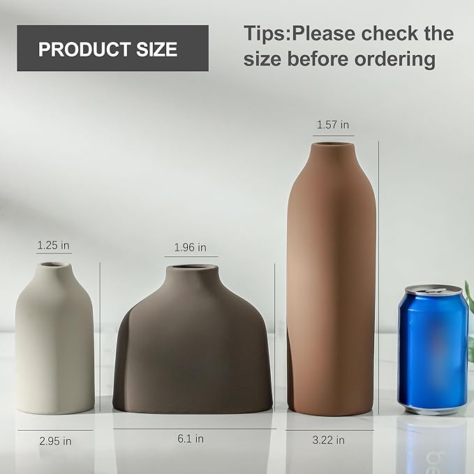 - Living Room Decor and Accessories – (Dimensions: 9.9” x 3.22”; 6.1”L x 1.96”W; 5.35”L x 2.95”) These vases are the ideal home house decor, effortlessly complementing any room or style. Whether your aesthetic is boho, modern farmhouse, rustic, or cottagecore, this versatile set brings a timeless, elegant touch to your space.