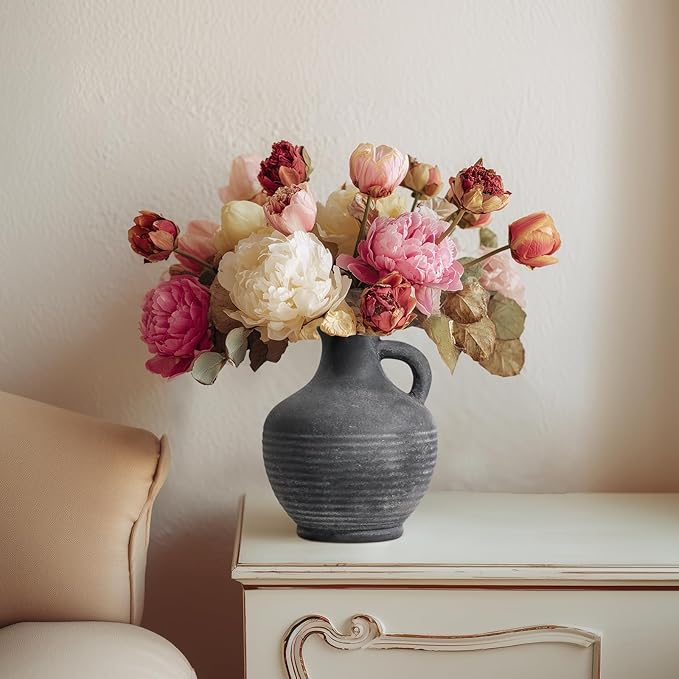 Black Ceramic Vase, Rustic Farmhouse Vase with Handle, 6 inch Terracotta Clay Small Vases, Centerpieces for Dining Table, Living Room, Bedroom, Entryway, Shelf Decor