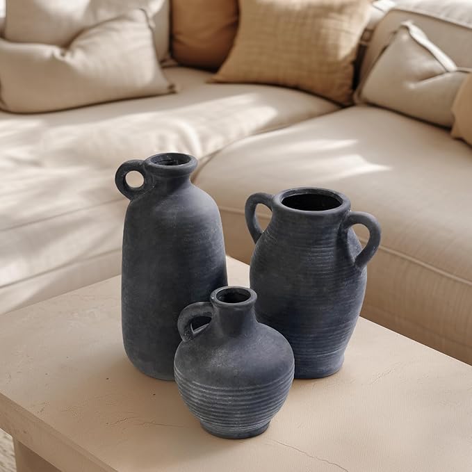 Sunddo Black Vases Home Decor, Rustic Farmhouse Ceramic Vase with 2 Handles, Vintage Stone Pottery Decorative, Living Room, Shelf Enterway, Wedding, Table Decor