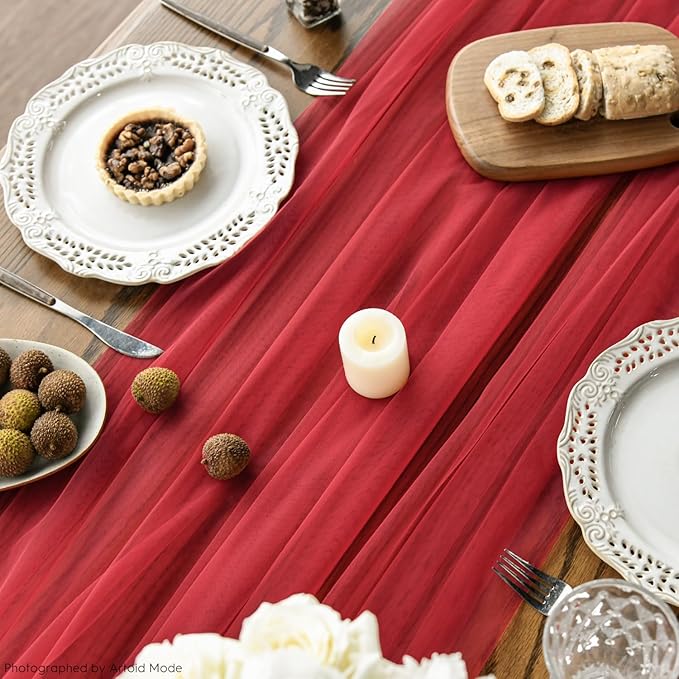 Artoid Mode 3PCS Red Gauze Table Runner 120 Inch 10FT, Seasonal Sheer Kitchen Dining Holiday Wedding Birthday Baby Shower Table Decor for Home Party