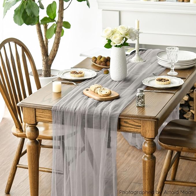 Artoid Mode 6PCS Grey Gauze Table Runner 120 Inch 10FT, Seasonal Sheer Kitchen Dining Holiday Wedding Birthday Baby Shower Table Decor for Home Party