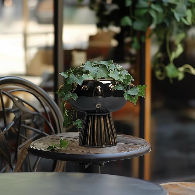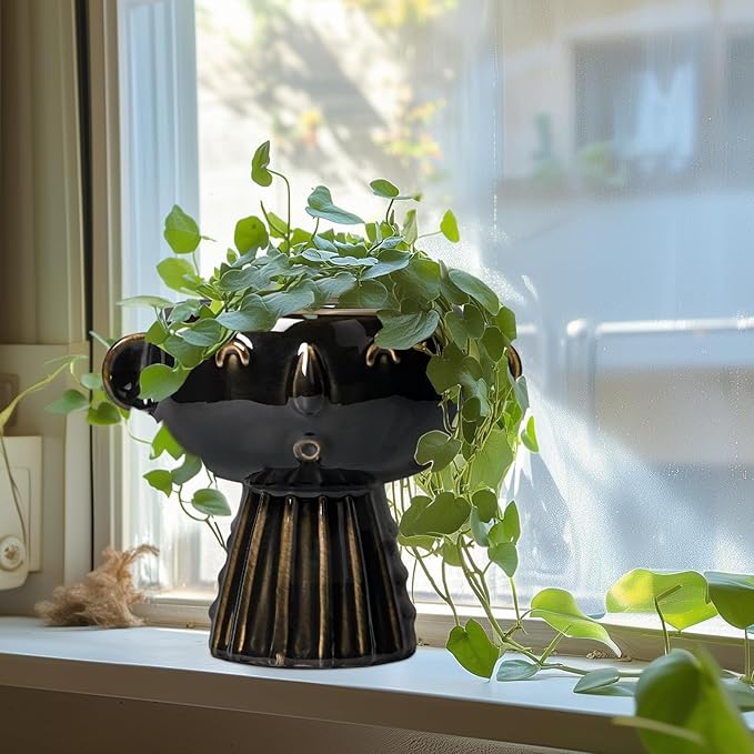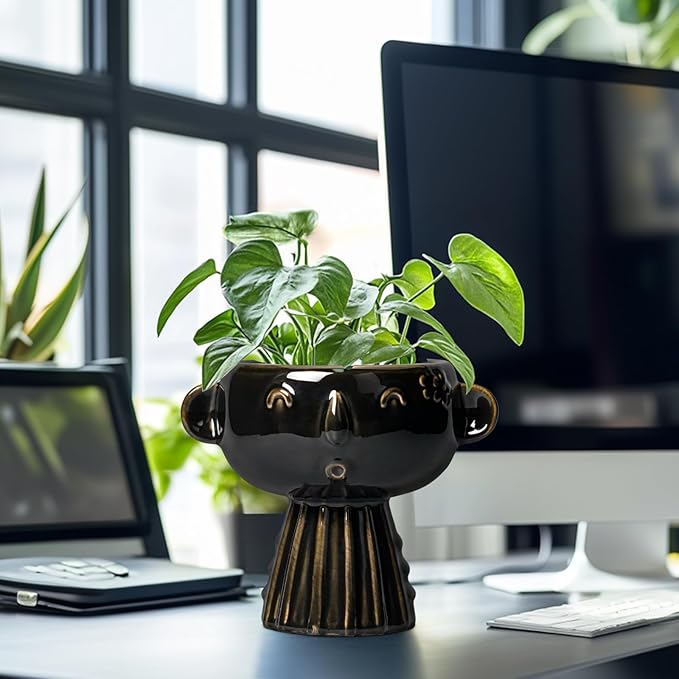 Head Planter 7 Inch - Ceramic Face Planters with Drainage Hole, Funny Succulent Pots for Indoor Outdoor, Cute Decorative Plant Pot, Desk Office Room Home Decor, Black